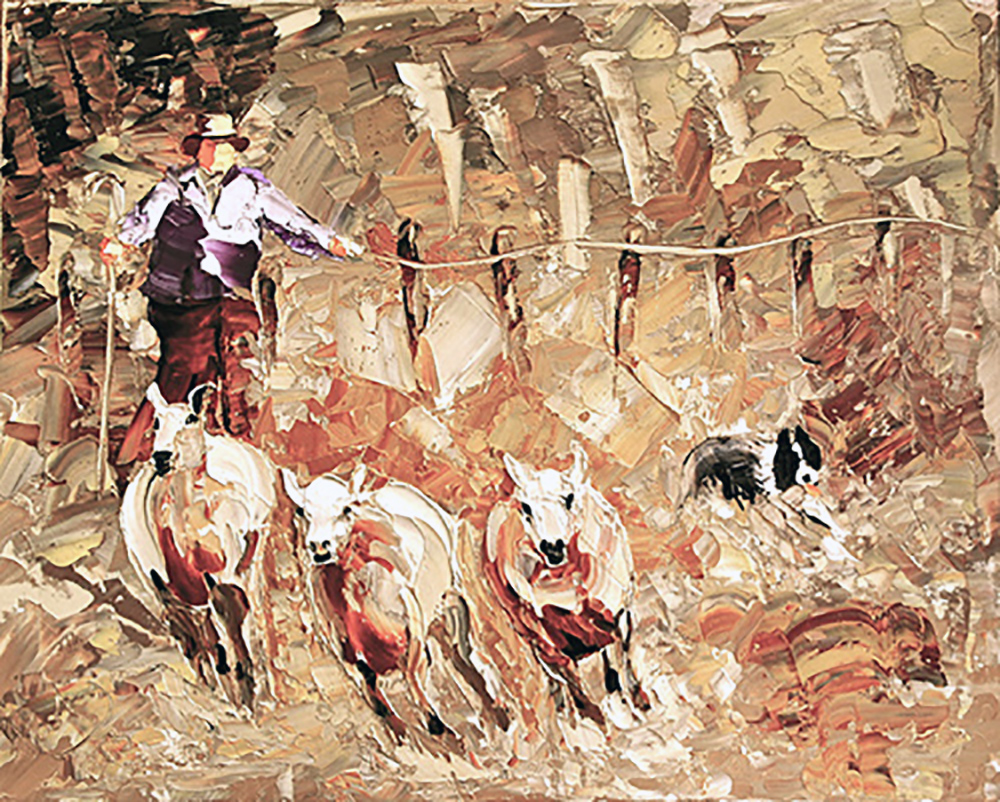 I count this painting as one of my best sporting paintings, Take Time, are the words the Farmer calls to his sheepdog when he perhaps is worrying the sheep, and not herding them, I have depicted them frightened and out of control, whilst the sheep dog takes a rest before springing to action again.